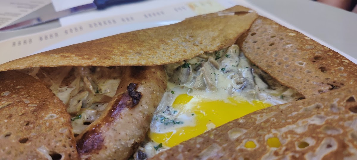The menu at Crêperie Du Bourg is a celebration of traditional French flavors, with a modern twist. One of the standout dishes is the Crêpe Saucisse, a savory crêpe stuffed with a mouthwatering sausage, perfect for those craving something hearty. For a true taste of Brittany, the Crêpe Bretonne la Vraie A L'andouille de Guéméné is a must-try. This crêpe is filled with authentic andouille sausage, a regional specialty, and brings a rich, smoky flavor that perfectly complements the delicate texture of the crêpe.